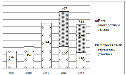 В 2013 году было предоставлено 313 земельных участков, в том числе 201 земельный участок для многодетных семей. Снижение наблюдалось за счет предоставление таких земельных участков посредством проведения аукциона.