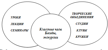 Однако следует отметить, что проведение кружков, факультативных, экскурсионных занятий, круглых столов и диспутов невозможно без групповых и коллективных форм организации деятельности. Следовательно, именно эти формы превалируют над индивидуальной формой.