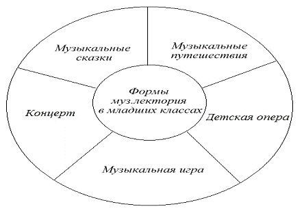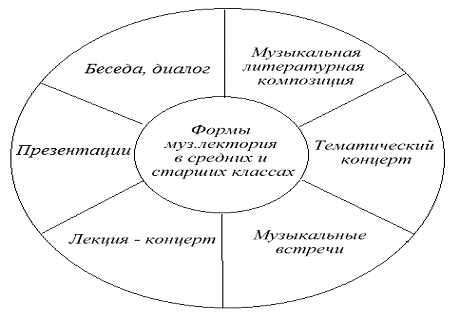Для учащихся средних и старших классов распространёнными формами музыкального лектория являются: 1) лекция - беседа, 2) музыкально-литературная композиция, 3) тематический концерт, 4) музыкальная гостиная.