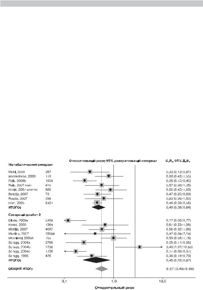 Рис. 4.17. Метаанализ ассоциации уровней витамина D в плазме крови и риска метаболических нарушений (сахарного диабета 2-го типа и метаболического синдрома) [18]