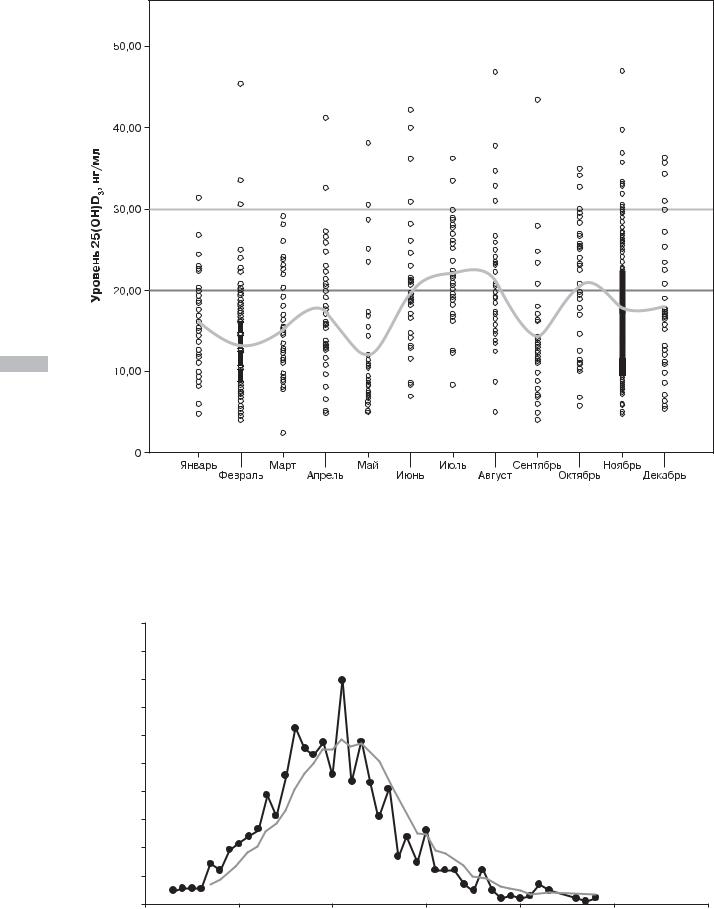 тами, содержащими холекальциферол, у значительной части детей и подростков даже в летние месяцы обеспеченность витамином D может лишь несущественно колебаться в интервале от 10 до 30 нг/мл, а частота тяжелого дефицита летом в целом составляет 5,7%. В течение остального периода года статус витамина D у подростков, проживающих в Москве, существенно ухудшается, а число детей с уровнем кальцидиола более 30 нг/мл с сентября по май составляет лишь 4,3%. В весенние месяцы по сравнению с осенними отмечается явная тенденция к снижению уровня кальцидиола, что объясняется исчерпанностью резервов, которые в условиях средней полосы России на протяжении зимне-весеннего сезона без целенаправленного профилактического приема препаратов холекальциферола сформировать невозможно.