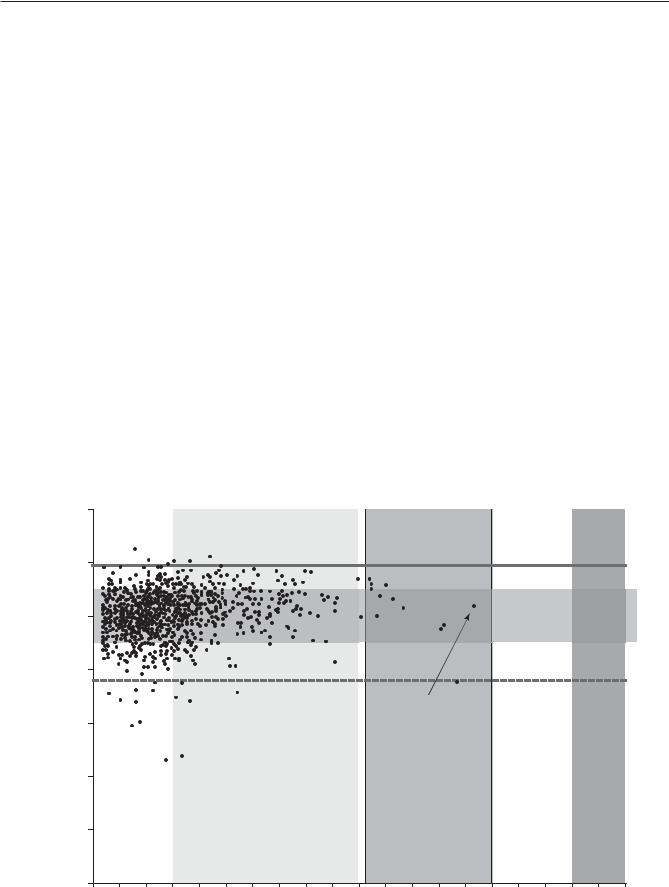 Анализ результатов, представленных в табл. 8.4, позволяет понять, у каких детей в процессе курса коррекции существует повышенный риск достижения потенциально опасного уровня 100 нг/мл. Дети с посткоррекционным уровнем кальцидиола сыворотки крови более 100 нг/мл (гипервитаминоз) были достоверно младше (p < 0,001), имели меньшую массу тела (p < 0,001) и, соответственно, большую среднесуточную дозу холекальциферола на 1 кг массы тела (p < 0,001), чем пациенты с уровнем менее 100 нг/мл. При этом ни один из 15 детей с уровнем кальцидиола сыворотки более 100 нг/мл не имел клинических признаков гипервитаминоза D, а последующий перевод этих детей на профилактическую дозу 1000 МЕ/сут сопровождался быстрой нормализацией уровня 25(ОН)D. Очевидно, что именно дети первых месяцев жизни, находящиеся, как правило, на грудном вскармливании, не получавшие профилактической дозы витамина D и имеющие минимальный уровень