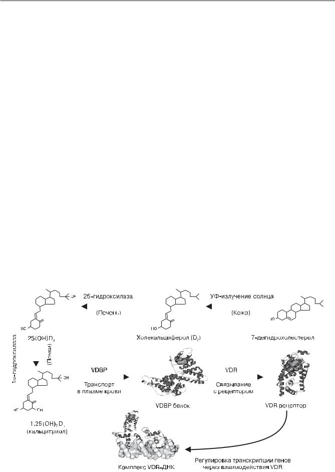 семейства цитохрома P450 25-гидроксилазы (CYP3A4) холекальциферол превращается в первый активный метаболит — 25-гидроксихолекальциферол [25(OH)D], или кальцидиол (см. рис. 2.1). В осуществлении этой реакции также задействованы цитохромы CYP2C9 и CYP2D6 [3].