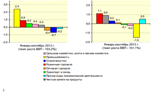 Объем ВВП в январе-сентябре 2013 г. составил в текущих ценах 452,1 трлн. рублей и увеличился по сравнению с январем-сентябрем 2012 г. в сопоставимых ценах на 1,1%. Прогнозом на 2013 год в соответствии с Указом Президента Республики Беларусь от 25 сентября 2012 г. № 418 предусмотрен его рост на 8,5%. Динамика производства валового внутреннего продукта представлена следующими данными: