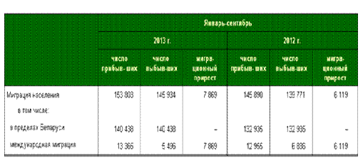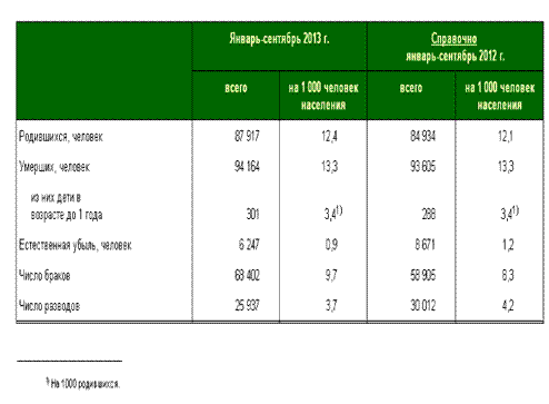 Естественная убыль населения в январе-сентябре текущего года уменьшилась по сравнению с соответствующим периодом 2012 года на 28% и составила 6 тыс. 247 человек. Миграционный прирост за январь-сентябрь составил 7 тыс. 869 человек (возрос по сравнению с аналогичным периодом 2012 года на 1 тыс. 750 человек, или на 28,6%) и компенсировал естественную убыль населения, обеспечив увеличение численности населения.