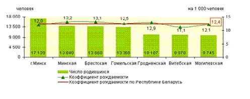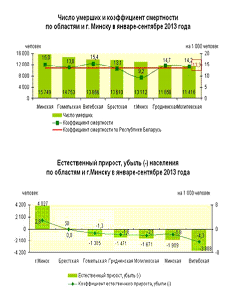 Общий коэффициент рождаемости за девять месяцев в целом по республике составил 12,4 на 1 тыс. жителей (за аналогичный период 2012 года - 12,1 промилле). Среди регионов страны самый высокий этот показатель - в Минской области (13,2 промилле), а самый низкий - в Витебской области (11,1 промилле). Общий коэффициент смертности за девять месяцев текущего года равнялся 13,3 на 1 тыс. населения (в январе-сентябре 2012-го он был также 13,3 промилле). Среди регионов страны самый высокий этот показатель - в Витебской и Минской областях (15,4 и 15 промилле соответственно), самый низкий - в Минске (9,2 промилле)