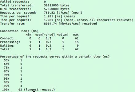 Видим, что сервер успешно справился, но по сравнению с html, затратил больше времени на обработку запросов: