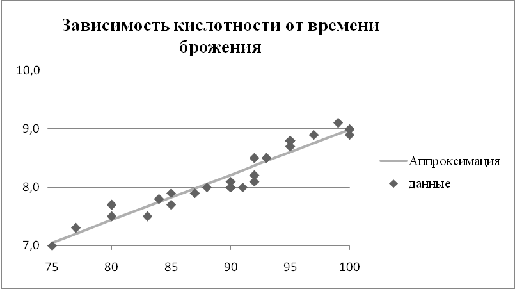 Действительно, согласно опытным данным, существует прямая зависимость между данными характеристиками, то есть при увеличении времени брожения теста растет значение кислотности. Эта зависимость легко описывается линейной функцией вида y=b0+b1x. Для ее нахождения воспользуемся методом наименьших квадратов.
