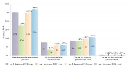 Поступление налога на имущество организаций сократилось на 17% (-0,8 млрд. руб.) относительно уровня 2011 года, составив 4 млрд. руб.