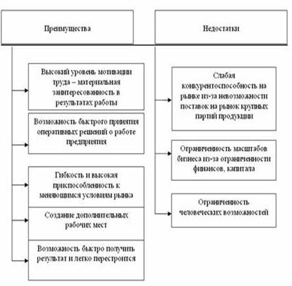 Научные и теоретические работы отечественных и западных специалистов убедительно доказывают возможность малого предпринимательства более гибко реагировать на изменяющиеся запросы рынка, и быстрее адаптироваться к внешней и внутренней среде. На рис. 9 представлены преимущества и недостатки малого бизнеса.