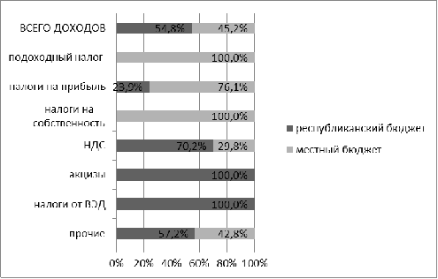 В структуре консолидированного бюджета 54,8% составляют доходы республиканского бюджета и 45,2% доходы местных бюджетов (без учета безвозмездных поступлений). Также видно, что между республиканским и местным бюджетами распределяются налог на прибыль организации и НДС. Полностью зачисляются в республиканский бюджет акцизы и налоги от внешнеэкономической деятельности, в местные бюджеты, в свою очередь, зачисляются подоходный налог, налоги на собственность.