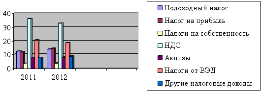Как следует из рисунка 2.1, формирование налоговых доходов за 2012 г. на 91,5 % обеспечено поступлениями налога на добавленную стоимость (32,9 %), налоговых доходов от внешнеэкономической деятельности (18,5 %), налога на прибыль (14,2 %), подоходного налога (14,0 %),акцизов (8,1 %), налогов на собственность (3,8).