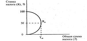 Кривая отражает взаимосвязь между ставкой налогов и поступлением за счет их средств в государственный бюджет. При повышении налоговой ставки доходы государства сначала увеличиваются. Если налоговая ставка превышает точку R0, то доходы от налоговых поступлений начинают уменьшаться. Высокие налоги снижают стимул производить у производителей, тем самым уменьшают доходы государства, и наоборот.