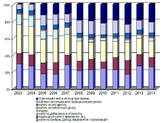 В таблице 1.1 представим данные Федерального казначейства Российской Федерации о налоговых поступлениях в консолидированный бюджет РФ в 2003-2014гг., а том числе можно увидеть поступления налога на прибыль и сделать вывод о его значимости в доходах бюджета.