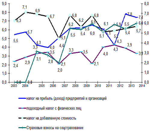 Если рассмотреть структуру налога на прибыль в ВВП, то можно увидеть, что его доля увеличилась с 5,5% в 2003г. до 7,4% в 2014г.(см.рис.1.2).