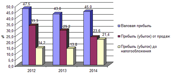 Из таблицы можно заключить, что себестоимость покупных товаров составляет более половины объема выручки компании (55% в 2014г.). Снижение коммерческих расходов обусловило увеличение доли прибыли от продаж в выручке с 14,2% в 2013г. до 21,4% в 2014г. Превышение доли прочих расходов над доходами обеспечило увеличение доли налогооблагаемой прибыли с 12,9% в 2012 г. до 18,5% в 2014г., что вызвало рост доли налога на прибыли в выручке с 2,6% в 2012 г.до 3,7% в 2014г.