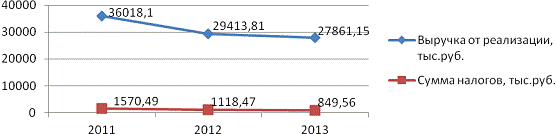 Как видно по рисунку 3 снижение выручки от реализации на предприятии ООО «Юграспецмонтаж» повлекло снижение сумм налогов, уплачиваемых предприятием в бюджет. При этом темпы снижения выручки опережали темп снижения налогов.
