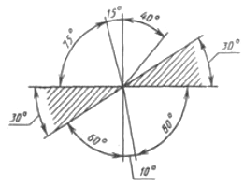 Розмірне число наносять під кутом 75° відносно прямої лінії, що думкою проводять між кінцями стрілок розмірної дуги. У заштрихованій на рис. 19 зоні розміри наносити не рекомендується, але якщо цього уникнути не можна, те їхній варто розташовувати над горизонтально розташованою полицею лінії-винесення. Для кутів малих розмірів при недоліку місця розмірне число також наносять над полицею лінії-винесення (рис. 19, кут 10°).