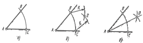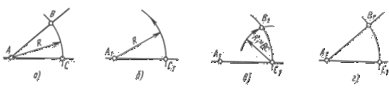 У тім місці креслення, де потрібно побудувати кут, рівний даному, проводять пряму лінію (у даному випадку горизонтальну). На ній задають крапку А1 (вершину кута). З крапки А1 радіусом R, рівним АВ чи АС, проводять дугу до перетинання з прямої, одержують крапку C1 (рис. 39, б). З крапки C1 радіусом R1, рівним відрізку ВС, роблять на дузі зарубку, тим самим знаходять крапку В1 (рис. 39, в). З'єднавши крапки A1 і В1, одержують кут B1А1С1, рівний даному (рис. 39, г).