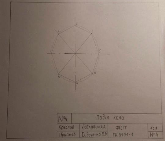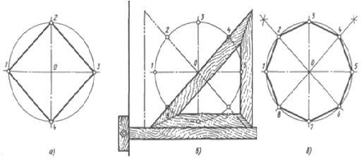 Розподіл окружності на вісім рівних частин і побудова правильного вписаного восьмикутника. Дві взаємно перпендикулярні лінії, проведені під кутом 45° до центрових ліній за допомогою косинця з кутами 45, 45 і 90° і рейсшини (рис. 47, б), разом з центровими лініями розділять окружність на вісім рівних частин.
