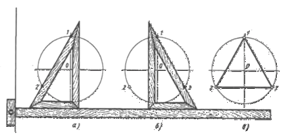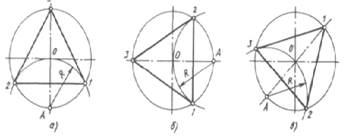 Розподіл окружності на три рівні частини і побудову правильного вписаного трикутника виконують за допомогою чи циркуля косинця з кутами 30, 60 і 90° і рейсшини.