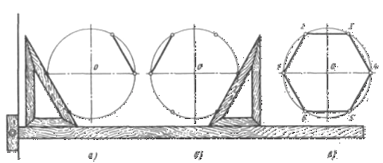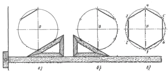правильного уписаного шестикутника за допомогою косинця і рейсшини показане на