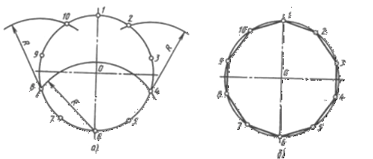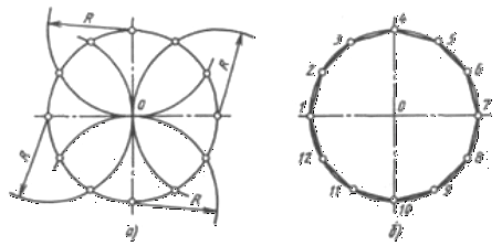 При розподілі окружності циркулем з чотирьох кінців двох взаємно перпендикулярних діаметрів окружності проводять радіусом, рівним радіусу даної окружності, дуги до перетинання з окружністю (рис. 53). З'єднавши отримані крапки, одержують дванадцятикутник.