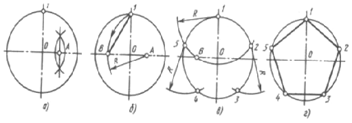 Половину будь-якого діаметра (радіус) поділяють навпіл (рис. 54, а), одержують крапку А. З крапки А, як з центра, проводять дугу радіусом, рівним відстані від крапки А до крапки 1, до перетинання з другою половиною цього діаметра, у крапці В (рис. 54, б). Відрізок 1В дорівнює хорді, що стягає дугу, довжина якої дорівнює 1/5 довжини окружності. Роблячи зарубки на окружності (рис. 54, в) радіусом R, рівним відрізку 1В, поділяють окружність на п'ять рівних частин. Початкову крапку 1 вибирають у залежності від розташування п'ятикутника. З крапки 1 будують крапки 2 і 5 (рис. 54, в), потім із крапки 2 будують крапку 3, а з крапки 5 будують крапку 4. Відстань від крапки 3 до крапки 4 перевіряють циркулем; якщо відстань між крапками 3 і 4 дорівнює відрізку 1В, те побудови були виконані точно. Не можна виконувати зарубки послідовно, в одну сторону, тому що відбувається нагромадження помилок і остання сторона п'ятикутника виходить перекошеної. Послідовно з'єднавши знайдені крапки, одержують п'ятикутник (рис. 54, г).