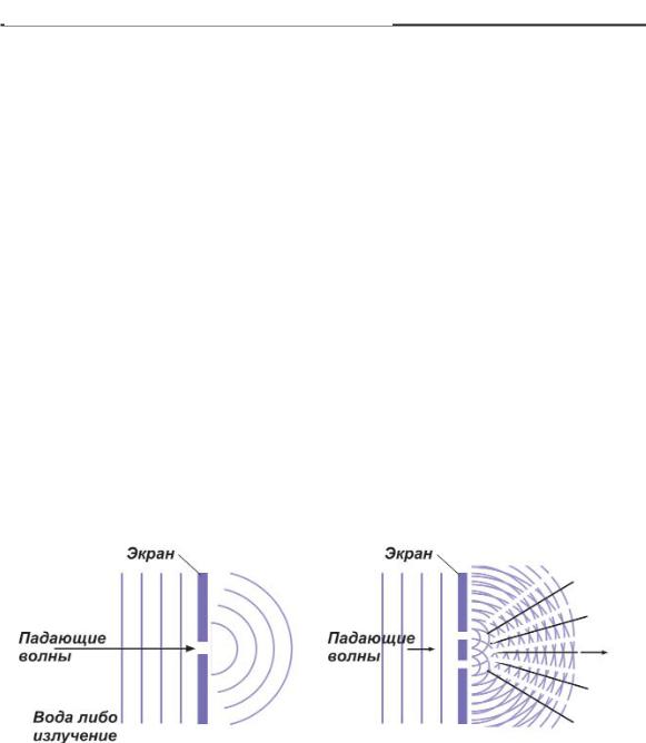 Когда распространяющийся плоский фронт волн на пове рхности воды достигает перегородки, в которой есть узкая щель, волны выходят из нее кругами. Это явление называется дифракцией. Дифракция присуща не только обычным волнам, но и всем видам излучения, включая радиоволны, световые волны и рентгеновские лучи. При наличии в перегородке нес кольких щелей каждая из них оказывается источником круго вых или сферических волн. Эти волны интерферируют (взаи модействуют) друг с другом, взаимно уничтожаясь в одних мес тах и усиливаясь в других.