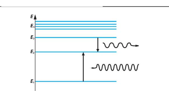 Рассмотрим вкратце принцип работы простейшего лазера. Мы выяснили, что при переходе атома из основного состояния, которому соответствует более низкий энергетический уровень, в возбужденное (где энергия, соответственно, выше) происхо дит поглощение фотона веществом с переходом на более высо кий энергетический уровень.