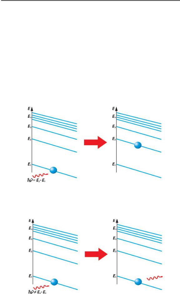 “А как же тогда электрон переходит на более высокий уро вень?”, – спросите вы. Предположим, что атом находится в сос тоянии n и обладает энергией En . Чтобы вынудить электрон перей ти на уровень m, мы должны каким то образом “выпихнуть” его из основного состояния, придав ему некоторую дополнительную энергию (подобно тому, как пинок тренера необходим, для того, чтобы лодырь оказался на перекладине). Для этого будем “обстре ливать” электрон световыми фотонами различной частоты. Напо