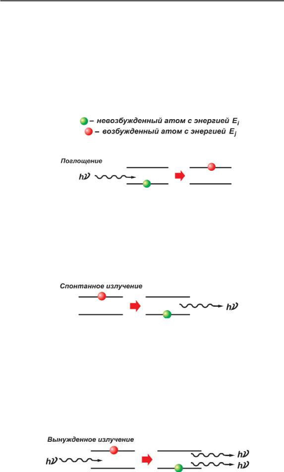 Однако существует и другой вид излучения, открытый Эйнштейном и называемый вынужденным, или индуцирован* ным. Индуцированное излучение происходит тогда, когда электрон в возбужденном состоянии снова подвергается действию внешнего электромагнитного излучения. При этом электрон переходит на более низкий энергетический уровень, испуская фотон, когерентный (идентичный по энергии и нап равлению) фотону, спровоцировавшему данный переход.