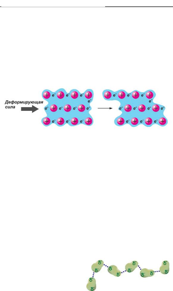 Металлическая связь объясняет свойства металлов, в част ности, их прочность. Под действием деформирующей силы ре шетка металла может изменять свою форму, не давая трещин, в отличие от ионных кристаллов.