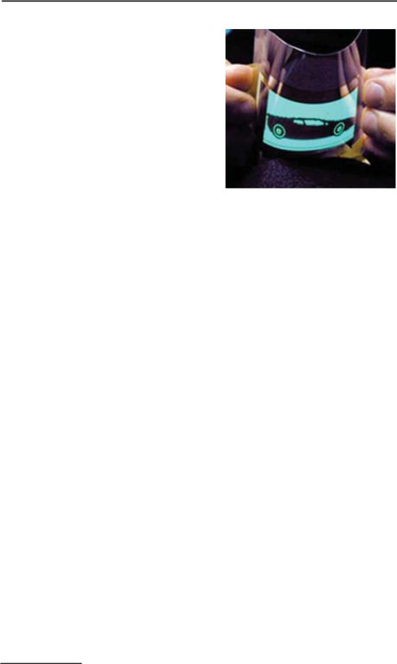 других переносных устройств. Ис ходным материалом для таких дисплеев будут новые светоизлу чающие полимеры, где излучение происходит в результате рекомби нации электронов и дырок. Также в скором времени следует ожидать массового производства новых пластиковых мониторов на основе полимерных матриц. На фото изображен один из лабораторных образцов таких дисплеев компа нии Universal Display.