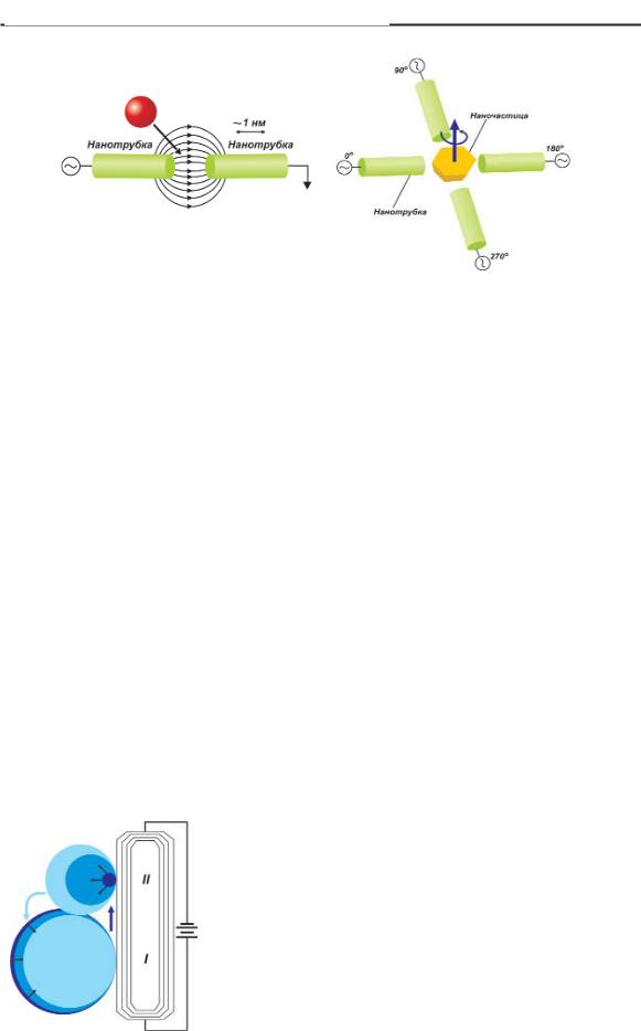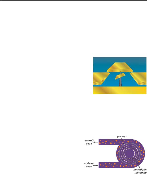 силах трения, можно заставить вращаться внешнюю нано трубку, воздействуя на нее газом. Если внутренний слой мно гослойной нанотрубки провернуть, она воз вращается в преж нее положение благодаря электростатике. При этом она дви жется маятникообразно с частотой несколько МГц, что позво лит сделать насос, нагнетающий в другую нанотрубку газ, зас тавляя ее вращаться.