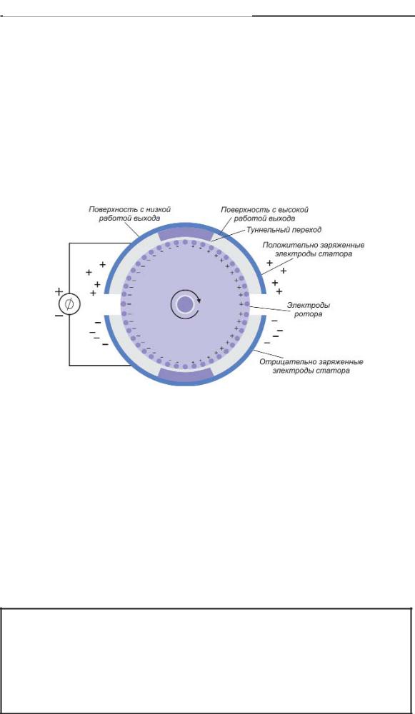 Электроды статора имеют две различные поверхности: с высокой и низкой работой выхода электродов. При подаче нап ряжения на электроды статора нанопроводники ротора заряжа ются через туннельные промежутки, причем неодинаково из за разной работы выхода электронов с поверхностей. Взаимодей ствие неоднородного распределенного по ротору заряда с электрическим полем статора вызывает вращение наномотора.