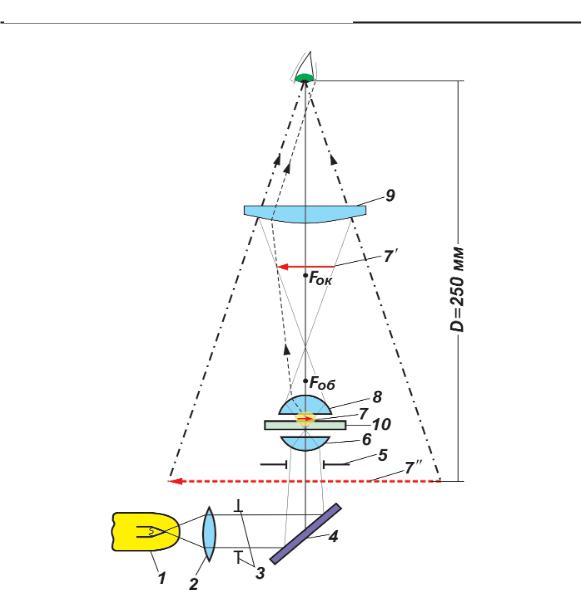 диафрагма для ограничения светового пучка; 4–зеркало; 5–апертурная диафрагма для ограничения светового пучка; 6–конденсор; 7– рассматриваемый объект (препарат); 7’–увеличенное действительное изображение объекта; 7’’–увеличенное мнимое изображение объекта; 8–объектив; 9–окуляр; 10–предметный столик)