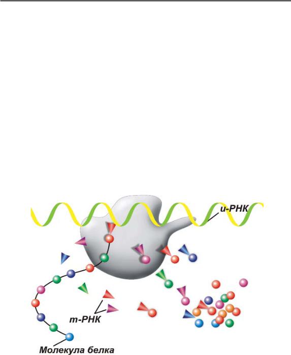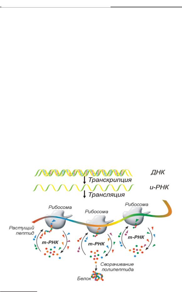 При синтезе белка информация о его структуре сначала дос тавляется из ДНК к молекуле рибосомы – своеобразной фабрике по производству белков. Этот перенос информации осуществля ется с помощью молекулы информационной РНК (рибонуклеино вая кислота), которая является точной копией, зеркальным отра жением структуры одного участка ДНК. И РНК – это одноце почная спираль, комплементарная одной нити молекулы ДНК