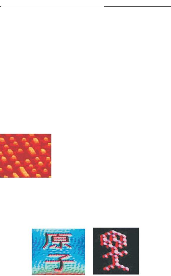 пехах в этом направлении говорит популярность так называе мой “нанолитографии” – выкладывания из атомов различных “рисунков” на поверхности подложки. На рисунках представ лены несколько примеров подобного “нанорисования”.