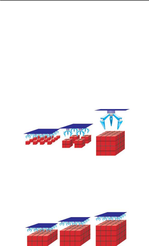 Итак, процесс конвергентной сборки выглядит следующим образом: сначала самые маленькие фабрикаторы создают из атомов элементарные “кирпичики”. Затем фабрикаторы по больше берут эти “кирпичики” и соединяют их друг с другом в более крупные блоки. Эти блоки, в свою очередь, также соеди няются между собой фабрикаторами третьего уровня и т.д. Весь процесс повторяется до тех пор, пока необходимый продукт с заданной пользователем формой, структурой, размерами и пр. не будет собран полностью.