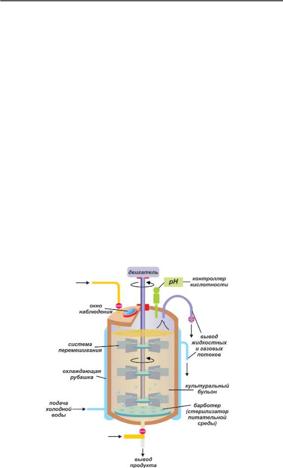 Через него прокачивают воздух, иногда насыщенный кис лородом. Температура регулируется с помощью воды или пара, пропускаемых по трубкам теплообменника. Конструкция фер ментера должна позволять регулировать условия роста: посто янную температуру, pH (кислотность или щелочность) и конце нтрацию растворенного в среде кислорода.