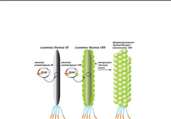 Рис 200. Фрагменты ДНК, кодирующие различные белки, внедряют в ДНК бактериофага, который синтезирует эти белки на своей поверхности. Вирус размножается, образуя длинные нити, покрытые металлом, которые можно использовать в наноэлектронике и наносистемах