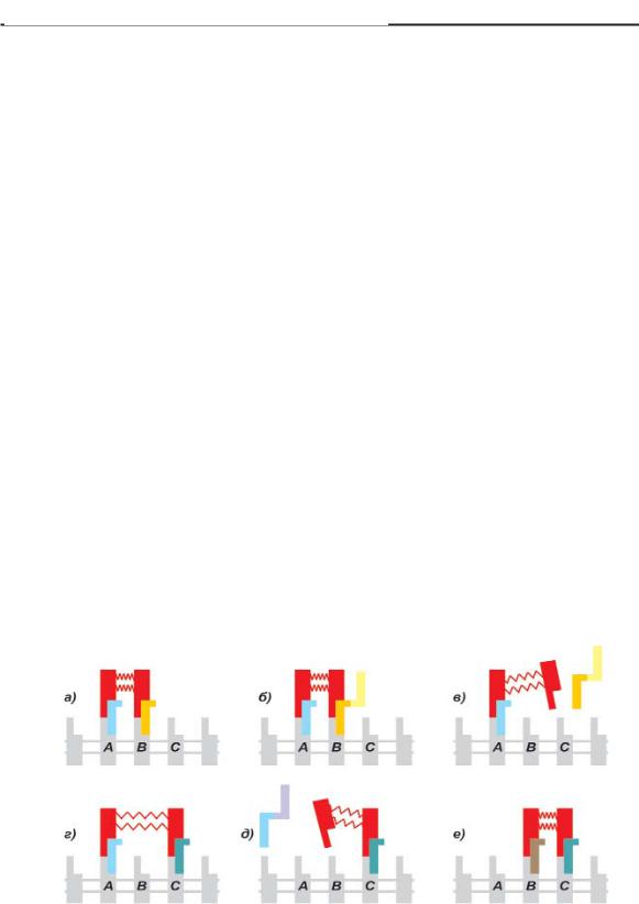 в) Свободная цепь убирает правый якорь, освобождая правую «ногу» от пары В; г) Якорная цепь пары С связывает свободную правую ногу;