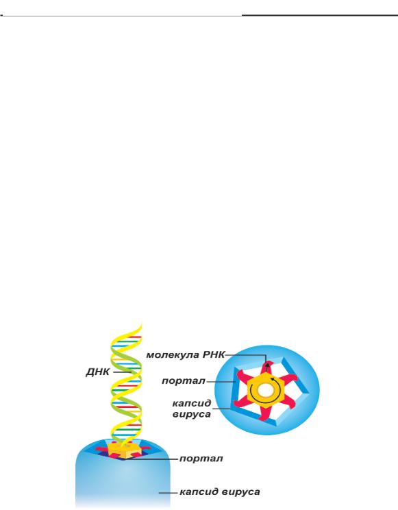 Оказалось, что вирус бактериофаг phi29 использует подоб ные конструкции из молекул РНК для своего вирального мото ра. При этом сам процесс работы мотора похож на работу дви гателя внутреннего сгорания автомобиля. Роль камеры сгора ния играет портал – образование внутри капсида (тела) вируса, занятое молекулами РНК и ротором. Мономеры РНК, подобно поршням, поочередно толкают центральный 6 сторонний ро тор, заставляя его вращаться. В центре ротора находится моле кула ДНК.
