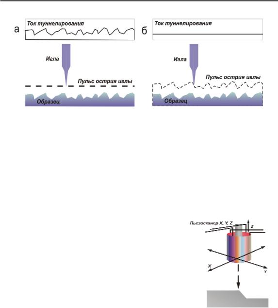 Врежиме постоянного тока СТМ задействуется система об ратной связи для поддержания постоянного тока туннелирова ния путем подстройки высоты сканирующего устройства над поверхностью в каждой ее точке (рис. 10б).
