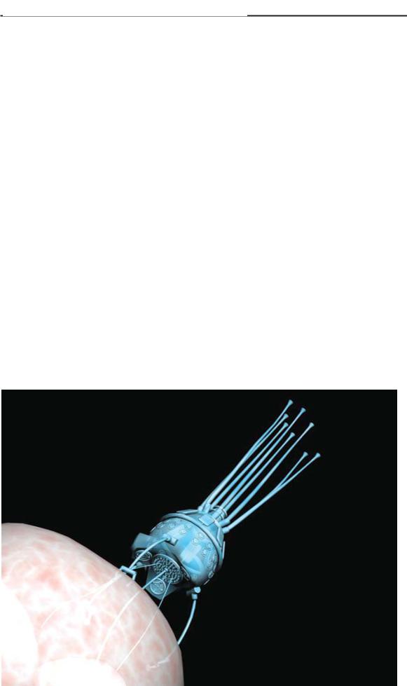 На рисунке изображен наноробот, ремонтирующий клетку in vivo. “Отработав”, нанороботы покинут тело обычным био логическим путем, а часть из них может остаться в организме на постоянное “дежурство”.