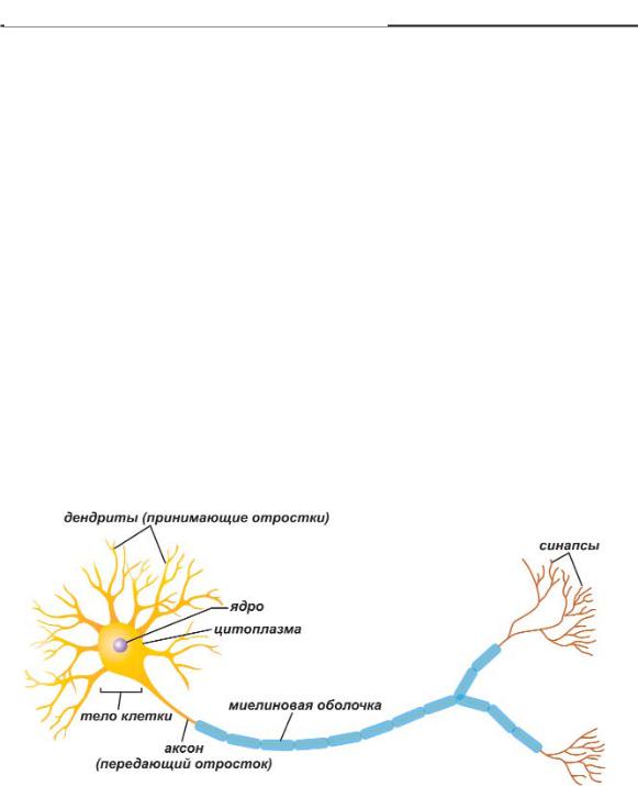 образные отростки, называемые дендритами, и один особенно длинный отросток, называемый аксон. Нервные клетки и их от ростки покрыты защитной миелиновой оболочкой, служащей для электроизоляции нейронов и их отростков. Аксон контактиру ет с дендритами других нейронов через специальные образова ния – синапсы, своеобразные усилители и выпрямители нерв ных сигналов. Таким образом, можно сказать, что наш мозг яв ляется своеобразной «вычислительной сетью», постоянно (да же во сне) обрабатывающей информацию.