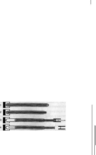I — опытная нанотрубка; 2 — нанотрубка после удаления внешних слоев на вершине; 3 — нанотрубка с внутренними слоями, вытянутыми при помощи специального наноманипулятора; 4 — релаксация (возврат) внутренних слоев нанотрубки