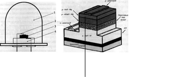 Рассмотрим принцип работы и процесс создания светодиодного прибора. Классическая схема изготовления светоДиода заключается в следующем: на поверхности сапфирового кристалла (подложке) выращиваются кристаллические слои полупроводникового материала, например на основе гетероструктур типа InGaN/AlGaN/GaN (индий-галлий-азот/алю- Миний-галлий-азот/галлий-азот), толщиной от 100 нм до 4,5 мкм (рис. 36). Продолжительность эпитаксиального рос-