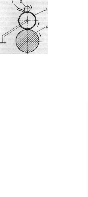 На рис. 47 представлена самая простейшая схема обработки наружной цилиндрической поверхности инструментом с резиновым покрытием. Инструмент 3 жестко закреплен на станке и приводится во вращение электродвигателем с гибким приводом. Смазочная среда в жидком или полужидком состоянии подается от насоса через сопло 1 в зону между прижимным роликом 2 и инструментом 3. Последний прижимается к поверхности вращающейся детали 4. В качестве смазочной жидкости используется смесь глицерина и олеата меди.
